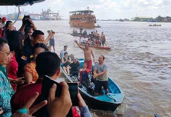 Edi ikut serta melempar bakcang dari atas kapal bersama tamu undangan lainnya. Bakcang yang dilempar ke sungai sesekali disambut oleh warga yang tengah mandi di sungai yang mengitari kapal wisata.